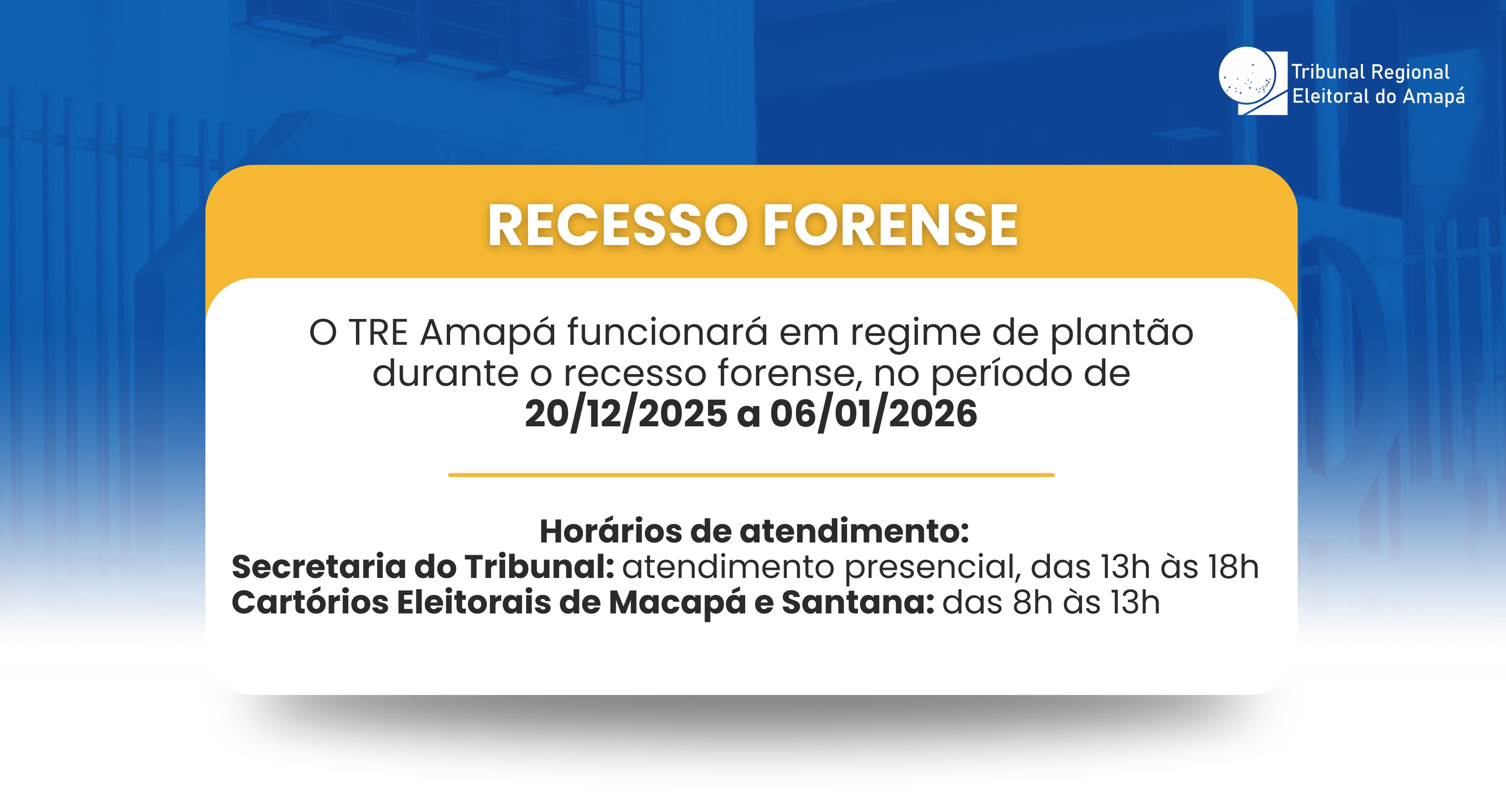 TRE Amapá divulga funcionamento em regime de plantão durante o recesso forenseDurante esse período, a Secretaria do Tribunal atenderá em regime presencial, das 13h às 18h, enquanto os Cartórios Eleitorais de Macapá e Santana funcionarão das 8h às 13hhttps://www.tre-ap.jus.br/administracao/destaques/tre-amapa-divulga-funcionamento-em-regime-de-plantao-durante-o-recesso-forensehttps://www.tre-ap.jus.br/@@site-logo/logo.jpg